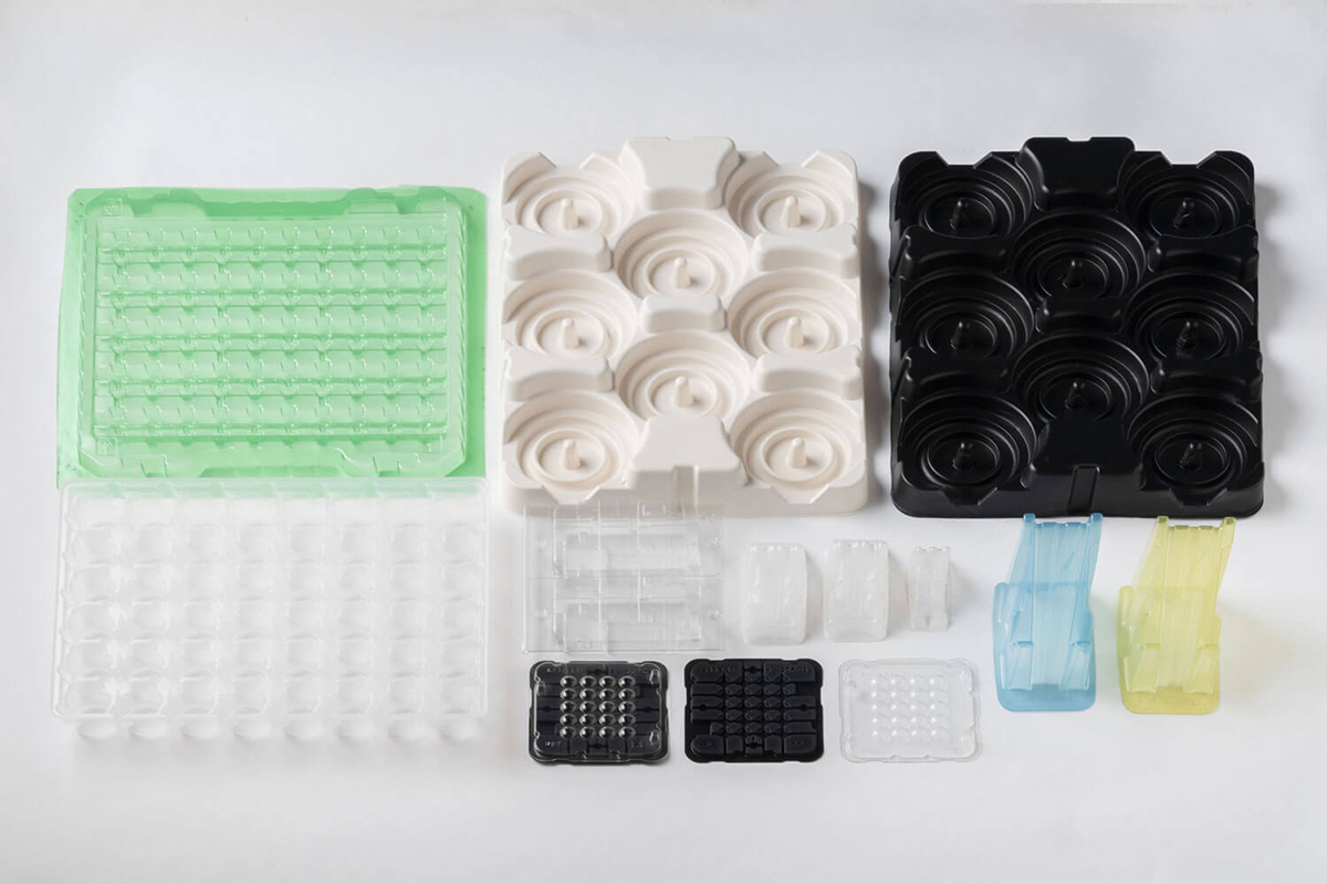 真空成形とは、シート状のプラスチックを加熱して柔らかくし、真空状態で金型に圧着させることでトレイを成形する技術です。自由自在に形を変えられるため、製品に合わせて複雑な形状のトレイを製造可能です。また、段ボールや発泡材と比べて発塵が少なく、クリーンな包装を実現できる点も特徴です。
