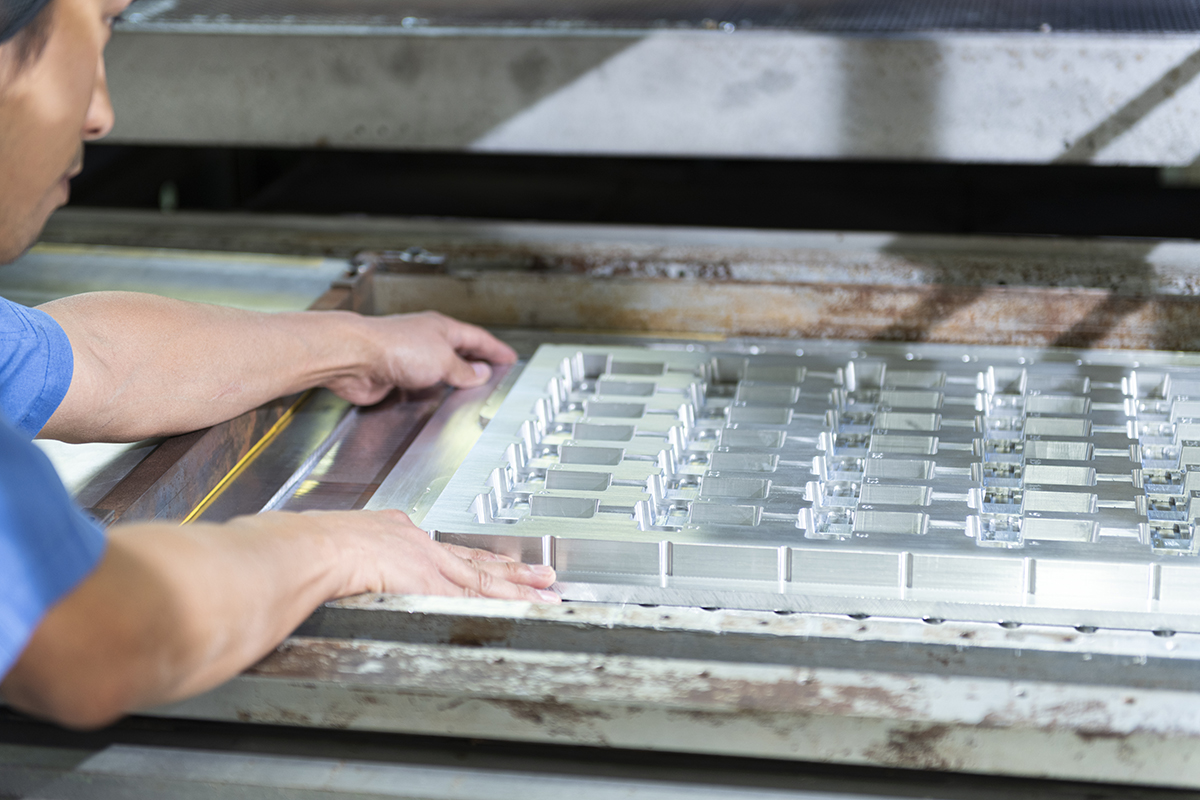 当初は、お客様から要望のあったブリスターパック(真空成形トレイの一種で、プラスチックケースと板紙がセットになったパッケージ)の製造からスタートし、その後、成形機・プレス機・金型を削るCNCマシンを導入し、本格的に真空成形トレイの生産を開始しました。現在は、24時間体制で5つのラインを稼働させ、大ロット・低コストの真空成形トレイの生産を得意としています。