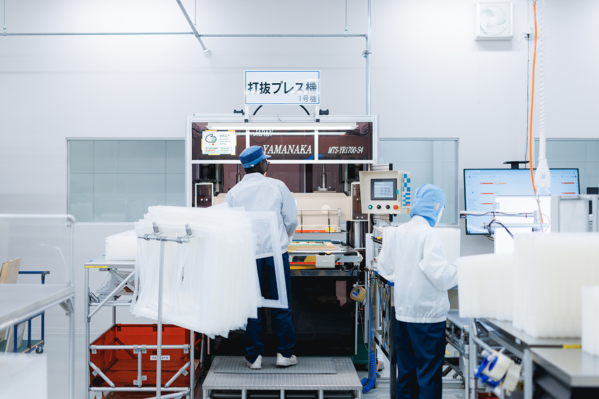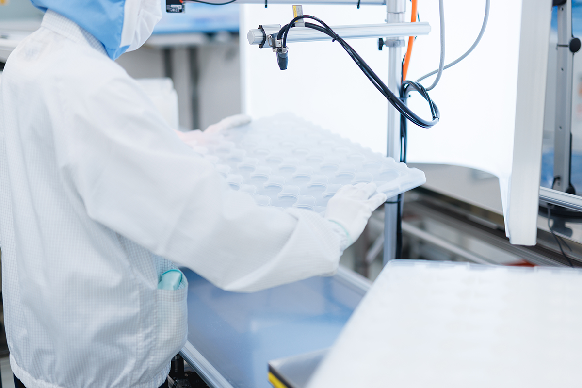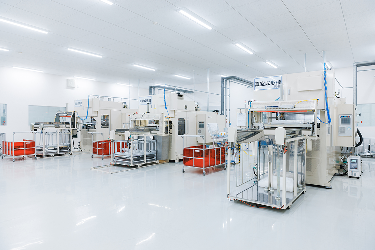一方、真空成形トレイは、ソリッド素材であることに加え、徹底した管理・検査体制のもとで製造するため、こうした資材と比較して高いクリーン度を実現できます。さらに、プラスチックを薄く引き伸ばして成形するため、ほかの包装材と比べて資材の量を抑えられるのも特徴です。このように品質とコストの両面で優位性を持つことから、当社は将来的な需要拡大を見据え、真空成形事業への参入を決めました。
